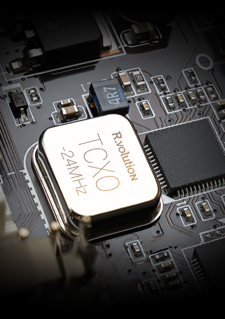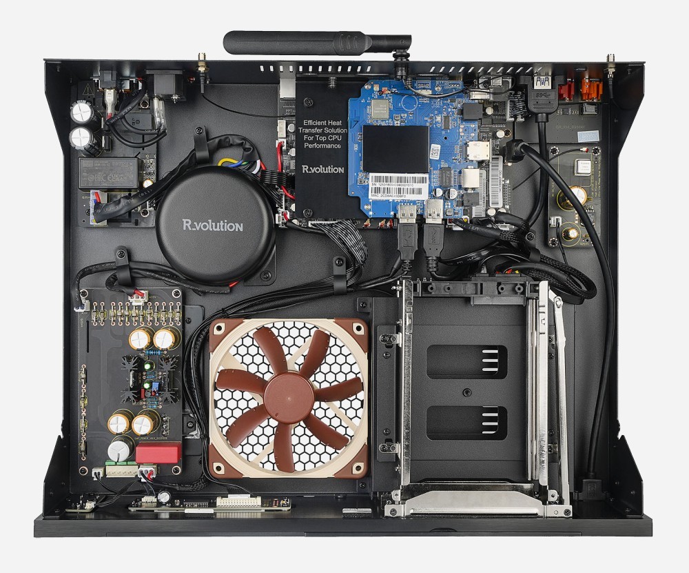 Por lo demás, encontramos las especificaciones del R_volution PlayerPro 8K. En primer lugar, una bahía doble para discos duros SATA de 3,5" y 64 TB, con una capacidad de almacenamiento total de 128 TB al momento de escribir este artículo. También incluye una sofisticada fuente de alimentación lineal basada en un transformador toroidal masivo y un reloj interno TCXO de 24 MHz de alto rendimiento (un múltiplo perfecto de 48 kHz para audio y 24 Hz para vídeo). Por lo tanto, la calidad de imagen y sonido se ve favorecida, tanto para reproducir archivos ISO Blu-ray 4K y MKV 4K, como para contenido de servicios de streaming.