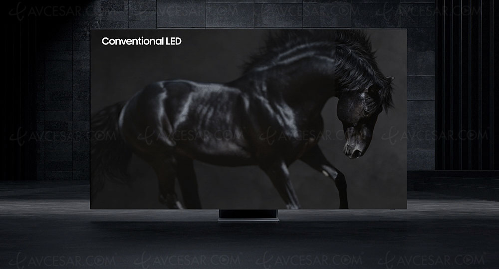 Del mismo modo, incorpora la nueva función Shape Adaptive Light para mostrar todos los detalles de una imagen modulando perfectamente el brillo de cada uno de los diodos. Por lo tanto, todos los tonos de negro de un caballo adecuado se pueden transcribir en la pantalla (ver foto arriba). Pero la función Shape Adaptive Light también reduce drásticamente el fenómeno de Blooming todavÃa presente alrededor de objetos luminosos o letras blancas sobre un fondo negro. En los televisores Samsung 2022 Neo QLED (Mini LED), el algoritmo Shape Adaptive Light es capaz de gestionar con especial precisión la cantidad de energÃa enviada a los diodos en las áreas de retroiluminación adyacentes a las que muestran estos objetos brillantes o letras para 'mostrar un menor brillo para una perfecta transición de su contorno con el resto de la imagen. Por supuesto, esta capacidad de distribuir perfectamente la energÃa a los diodos especÃficos también permite un pico de luz más alto para luces especulares increÃblemente brillantes.