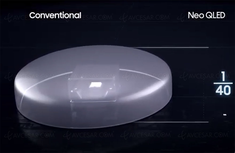 Otro desarrollo notable, el sistema Quantum Mini LED se acompaña de un notable adelgazamiento de las pantallas. De hecho, los LED tradicionales están coronados por una lente, que también actúa como protección, para difundir ampliamente la luz. Con la tecnologÃa Quantum Mini LED, esta lente ha desaparecido (la gran cantidad de diodos elimina la necesidad de difundir ampliamente la luz de muchos menos diodos), reemplazada por una pelÃcula ultrafina exclusiva de la marca para guiar la luz allà es necesaria. Asimismo, los Mini LED se integran directamente en el panel LCD para un grosor total muy reducido. Es decir, este sistema debe compararse con la tecnologÃa OD0 (distancia óptica cercana a 0) desarrollada por muchos especialistas chinos en LED y que, por supuesto, deberÃa aparecer rápidamente en los televisores de marca china.