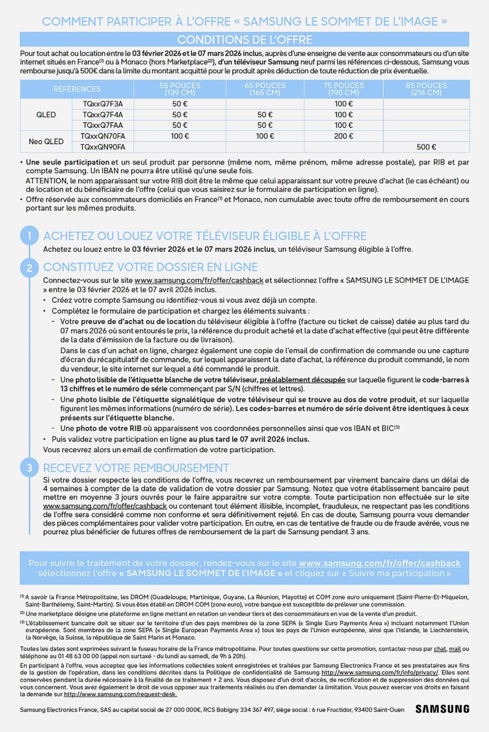 Hasta el 7 de marzo de 2026, por la compra de cualquier televisor que aparezca a continuación (haga clic en su referencia para obtener más información sobre el producto), la marca le reembolsará: • 50 € por un televisor Samsung TQ55Q7F3, Samsung TQ55Q7F4, Samsung TQ55Q7FA, Samsung TQ65Q7F3 o Samsung TQ65Q7F4 • 100 € por un televisor Samsung TQ75Q7F3, Samsung TQ75Q7F4, Samsung TQ75Q7FA, Samsung TQ55QN70FA o Samsung TQ65QN70FA • 200 € por un televisor Samsung TQ75QN70FA • 500 € por un televisor Samsung TQ85QN90F