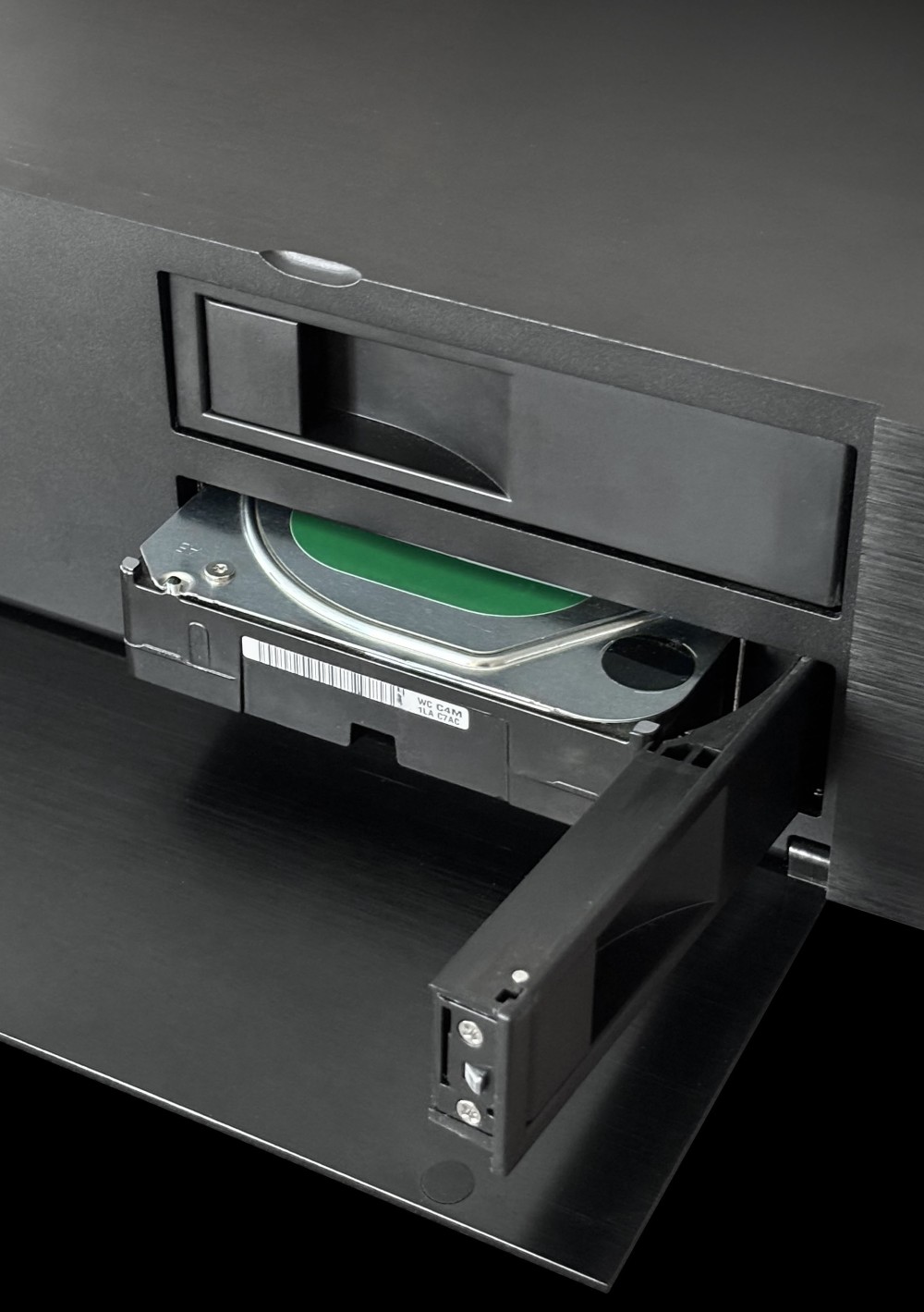 Por lo demás, encontramos las especificaciones del R_volution PlayerPro 8K. En primer lugar, una bahía doble para discos duros SATA de 3,5" y 64 TB, con una capacidad de almacenamiento total de 128 TB al momento de escribir este artículo. También cuenta con una sofisticada fuente de alimentación lineal basada en un transformador toroidal masivo y un reloj interno TCXO de 24 MHz de alto rendimiento (un múltiplo perfecto de 48 kHz para audio y 24 Hz para vídeo). Por lo tanto, la calidad de imagen y sonido se ve afectada favorablemente, tanto para reproducir archivos ISO Blu-ray 4K y MKV 4K, como para contenido de servicios de streaming. Esta es una novedad para este tipo de hardware; se afirma que el rendimiento es superior al de un Apple TV o una nVidia Shield.