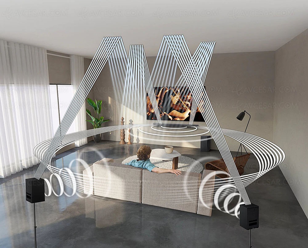 Su sofisticada ergonomÃa permite, según los deseos del usuario, colocar los altavoces envolventes inalámbricos de forma convencional en la parte trasera del punto de escucha para crear una auténtica burbuja sonora o colocarlos delante con el frontal. En este caso, es posible modificar la radiación sonora de los alrededores para adaptarlos a esta nueva configuración.