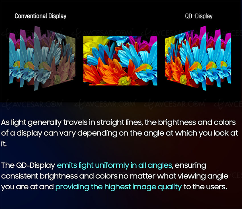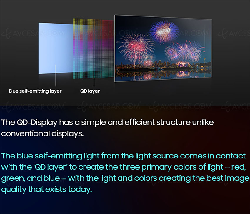 Como recordatorio, a diferencia del panel Woled (White Oled) producido por LG Display y equipado con filtros de color para recrear los tintes RGB de los diodos amarillos y azules (y verdes en el caso de los paneles Evo), integrados en todos los televisores Oled disponible en tiendas para todas las marcas), el panel QD Oled desarrollado por Samsung Display se basa en un solo diodo orgánico, un emisor azul revestido en una triple capa, asociado con convertidores de color Quantum Dots rojo y verde (cf. nuestras noticias QD Oled TV paneles Samsung Display en estudio en Panasonic y Sony). Esta arquitectura permite generar colores mucho más puros.