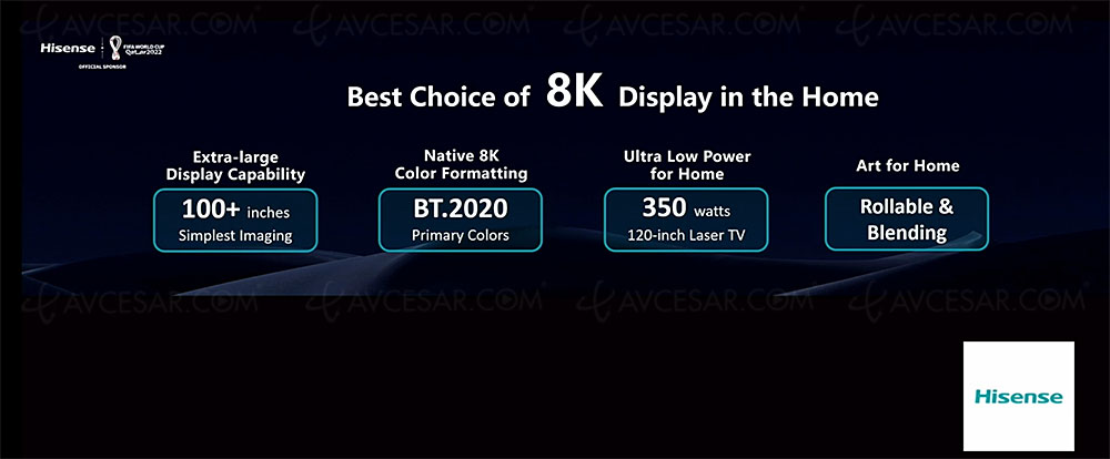 El Dr. Liu Xianrong, CientÃfico Jefe y Gerente General de Hisense Laser Display, aclaró las muchas fortalezas de Laser TV: imagen de (muy) gran formato a través de pantallas de 100 '' (254 cm) y 120 '' (305 cm)), Calidad de imagen idéntica a una pantalla de TV HDR con un Laser TV de triple láser pero sin luz azul (luz reflejada en la pantalla), y un consumo energético reducido en comparación con un TV convencional. Por ejemplo, el Dr. Liu Xianrong indicó que un televisor láser consume 350 W para una imagen de 120 '' (305 cm), una cifra similar a un televisor LED de 75 '' (191 cm) u 85 '' (216 cm)). . Más detalles en 2022…