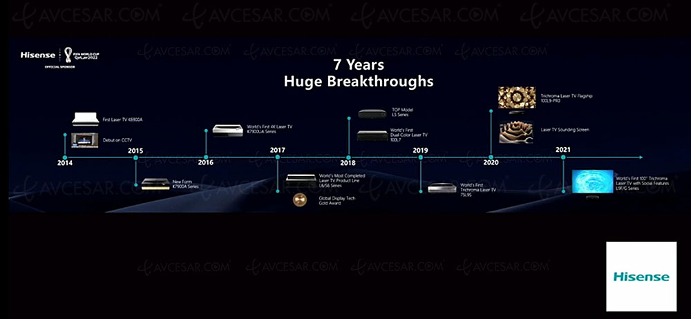 Como recordatorio, los televisores láser Hisense se construyen a partir de un proyector de alcance ultracorto, un sintonizador TNT y una pantalla técnica ALR (o CLR) para reproducir una imagen dinámica y colorida incluso en un entorno brillante. Porque la ambición del fabricante Hisense con sus televisores láser es reemplazar el televisor en los salones de consumidores (haga clic en el siguiente enlace para descubrir el archivo editorial dedicado a esta categorÃa de productos, El proyector ultracorto reemplaza el televisor en ferias comerciales, para aprender más sobre estos productos).