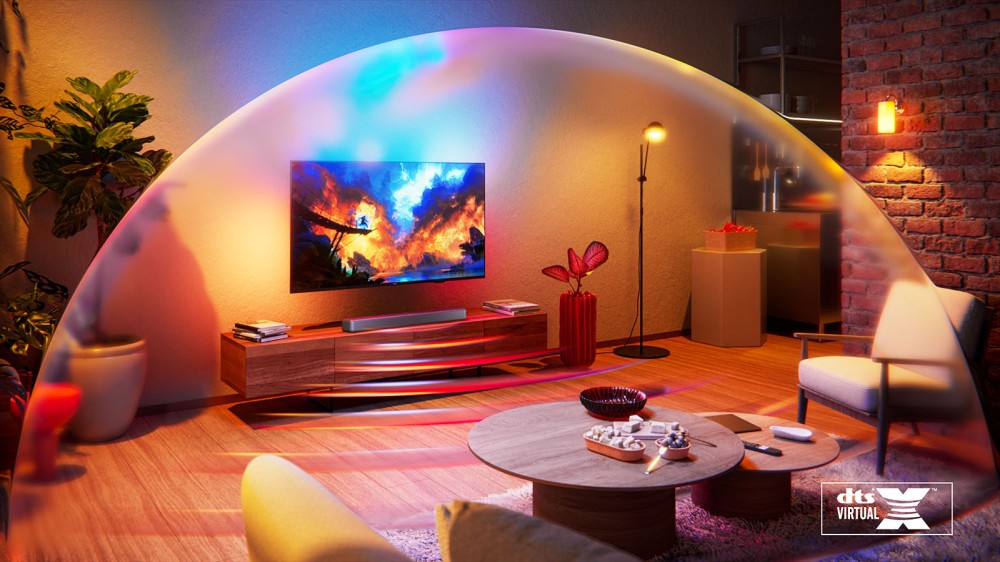 La barra de sonido admite bandas sonoras Dolby Digital+ y DTS Virtual:X para ampliar el escenario sonoro y mejorar los efectos. También cuenta con conectividad HDMI ARC y Bluetooth 5.4 con compatibilidad LE Audio, ideal para música o contenido móvil.