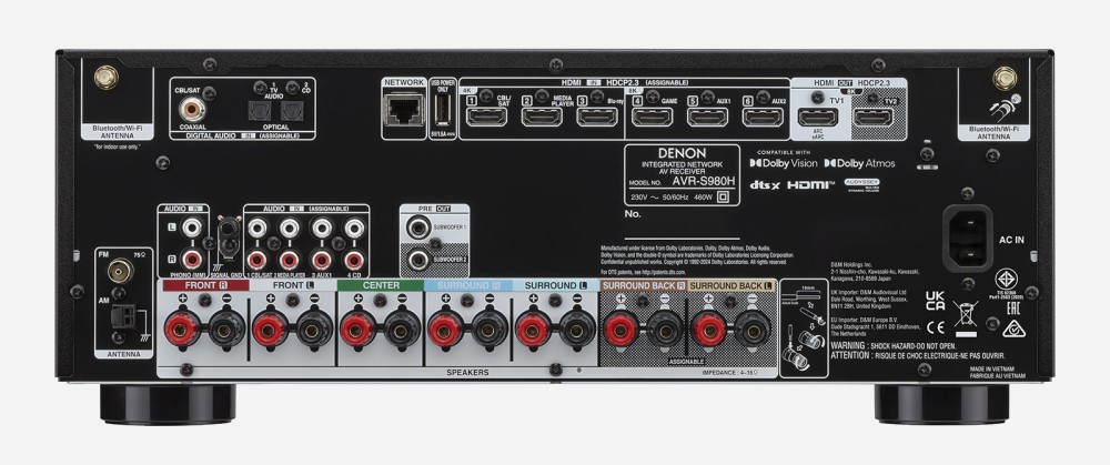 Como se mencionó anteriormente, mientras que el AVR-S950H ofrecía ocho entradas HDMI 2.0b, incluyendo una en el panel frontal, y dos salidas HDMI, el AVR-S980H reduce ligeramente el número de entradas a seis, pero tres de ellas son 2.1, lo que garantiza la compatibilidad futura. Todavía encontramos dos salidas de subwoofer, una entrada de fono, dos entradas ópticas, una entrada coaxial, una entrada de fono, cuatro entradas RCA estéreo, el puerto USB frontal, un puerto Ethernet y siete terminales de tornillo.