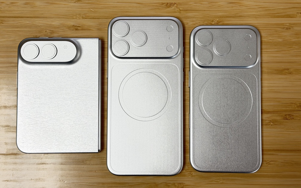 Mientras la producción de prueba está en marcha para el primer iPhone plegable, los fabricantes de accesorios, en particular los que producen fundas protectoras, ya han tenido en sus manos maquetas, y las fotos, por supuesto, ya circulan en línea. Una pantalla principal de 7,8" con un tamaño similar al de un iPad Mini. Es el "filtrador" Vadim Yuryev quien publicó estas nuevas imágenes filtradas, que muestran maquetas una al lado de la otra del iPhone 18 Pro Max, iPhone Ultra y iPhone 18 Pro. También podemos ver el dispositivo en su estado plegado (foto en la parte superior del artículo), así como desplegado debajo de un iPhone 17 Pro Max, lo que nos permite apreciar el tamaño de la pantalla principal (7,8"), tan ancha como la longitud del iPhone normal, y más alta (111,5 mm frente a 71,5 mm).