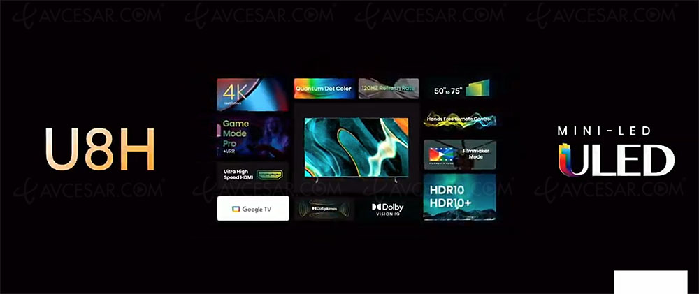 Reemplazando las muestras U8GH, las evoluciones de las pantallas Hisense U8HQ residen principalmente en la presencia de un sistema de retroiluminación Mini LED en lugar de una muestra de atenuación local Full LED asociada con un panel LCD nativo de 10 bits y 100 Hz. El fabricante asiático anuncia un poco más de cien zonas (120 en el 65 '') y un pico luminoso en 1.500 nits.