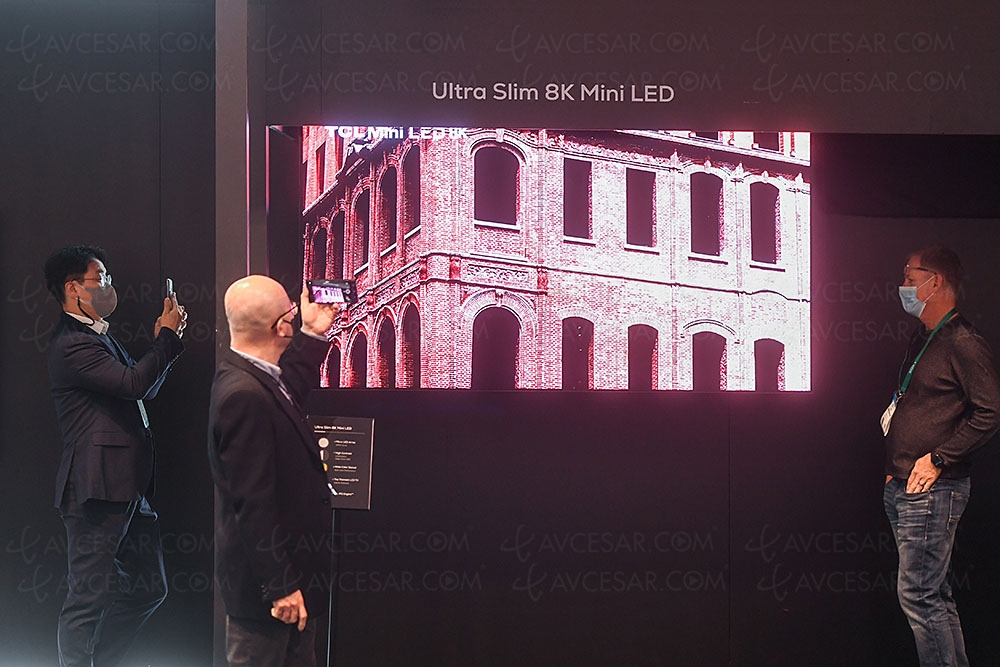 Con el aspecto de dos gotas de agua en un televisor OLED, el televisor LED TCL 85 '' Ultra Slim Mini LED Ultra HD 8K tiene un sistema de retroiluminación con aproximadamente 2,000 zonas. TCL indica que este nuevo televisor está equipado con la cuarta generación de retroiluminación Mini LED (OD Zero para la tercera y Vidrian para la segunda). Si los representantes de TCL no formularon detalles sobre una próxima comercialización de un televisor LED Ultra Slim Mini (Vidrian finalmente no vio la luz en las tiendas, OD Zero sí), este prototipo proporciona información valiosa sobre el camino explorado por el fabricante.